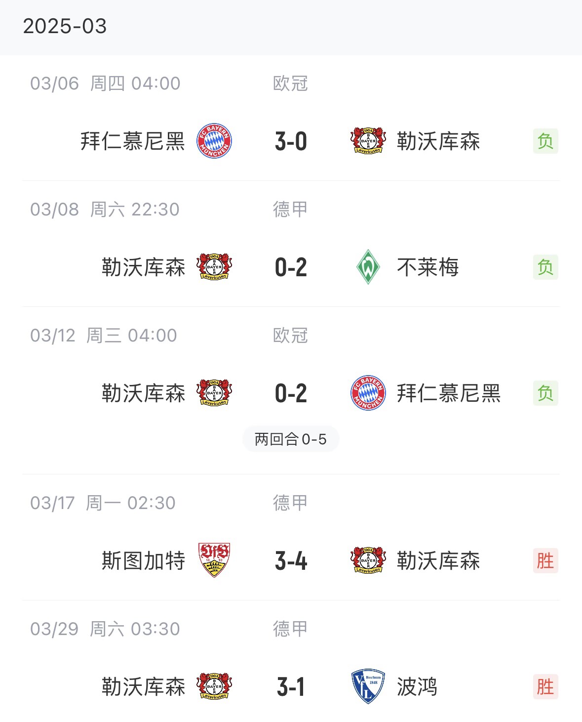 在欧冠1/8决赛首回合0-3不敌拜仁后,回到德甲,药厂0-2不敌不莱梅,欧冠被拜仁以总比分5-0淘汰出局。此后,在四月初,勒沃库森先是在德国杯爆冷不敌德丙球队比勒菲尔德无缘决赛,此后三轮对阵德甲下游球队,先是依靠绝杀艰难击败海登海姆,此后遭遇2连平,积分差距进一步被拜仁拉大。若下一轮拜仁赢球,勒沃库森无法取胜,拜仁将提前夺冠。