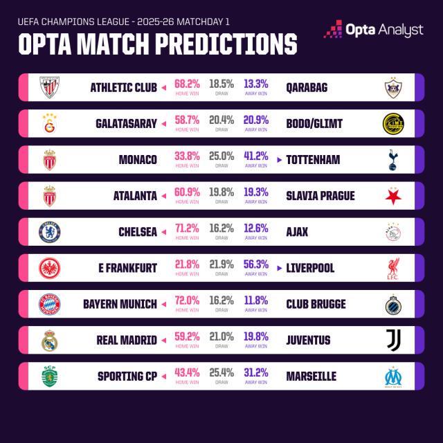 鉴于前一天的强强对决踢成了一边倒,我们有理由怀疑皇马主场迎战尤文也会像阿森纳与马竞那样“不太平衡”。而从双方的近期状态来看,意甲老妇人也确实有失传统豪门的身份,自9月击败国际米兰以来已经连续6场各项赛事不胜,包括欧冠战平多特蒙德和比利亚雷亚尔,以及意甲的3平1负。上周末,尤文客场0比2不敌科莫,坊间甚至传出了主帅图多尔帅位不稳的消息。科莫能打爆尤文,重要法宝是出身自皇马青训且皇马拥有回购权的阿根廷进攻型中场帕斯,那么正牌皇马上场,就更没有理由让到访的斑马军团讨到便宜。而就过去3场的情况来看,阿隆索的球队还算恢复得不错,没有因马德里德比的惨败而迷失。在2比5输给马竞之后,他们3场全胜打进8球仅失1球。当然,皇马前一轮的欧冠对手阿拉木图凯拉特确实实力偏弱,而上周末对赫塔菲的1比0小胜也赢得不是特别轻松。再考虑到本周日就将是与巴塞罗那的国家德比,皇马会对尤文“有所保留”也不是完全不可能。不过巴萨在周三凌晨赢得很畅快,于希腊客场6比1暴打奥林匹亚科斯,那么皇马会不会也想在气势上不输给巴萨?周末之前,皇马将比巴萨少休息一天,但前者不用奔波客场,所以也有不少发力的空间。而依照Opta超级计算机的模拟推演,皇马的赢面很大,有59.2%的获胜概率,远高于尤文图斯的19.8%。不过需要注意的是,皇马后防依然伤病不少,此前对马赛吃到红牌的卡瓦哈尔也将停赛。相较于皇马的获胜概率,英超卫冕冠军利物浦得到的推算结果则为56.3%,要稍低一些,但考虑到红军是客场作战,这其实已经说明超算非常看好斯洛特的球队能够击败法兰克福。在此之前,利物浦已经连续输给水晶宫、加拉塔萨雷、切尔西和曼联,遭遇自2014年11月以来的最长连败,若是再败,那就将是该队自1953年以来的最差表现。从理论上来说,法兰克福应该是个相对好对付的对手。他们近3场1平2负,德甲只是排在中游,欧冠上一轮也踢不过马竞。但利物浦的问题主要在于自身,萨拉赫状态严重下滑,球队原有的进攻体系已经崩坏,而新的构架又比较混乱,导致攻防两端全是漏洞,需要主帅斯洛特逐一理顺。另外红军本场还新添了一条烦恼:中场大将赫拉芬贝赫因伤无缘出征。由于航班因“技术问题”延误,利物浦还取消了赛前新闻发布会。如此媒体也就无从就赫拉芬贝赫的问题向斯洛特提问,只能推断荷兰中场的位置很可能由柯蒂斯·琼斯顶替。这会不会进一步削弱红军的中场控制力?让后防处于更大的被动?但或许利物浦更应该尝试用进攻压垮对手,毕竟法兰克福的防守一般,近5场丢球多达18粒,且红军阵中还有对他们很熟悉的法鹰旧将埃基蒂克。最后,还有个有趣之处可以一提:上轮欧冠利物浦客场0比1输给加拉塔萨雷,而后者再前一轮的对手正是法兰克福,比赛结果是法鹰在主场5比1大胜土超豪门。另一方面,上轮5比1痛打法兰克福的马竞又曾是利物浦的手下败将,只是法鹰输的是客场,而利物浦则是主场获胜。欧冠联赛阶段第3轮周四凌晨对阵00:45 毕尔巴鄂竞技vs卡拉巴赫00:45 加拉塔萨雷vs博德闪耀03:00 摩纳哥vs热刺03:00 亚特兰大vs布拉格斯拉维亚03:00 切尔西vs阿贾克斯03:00 法兰克福vs利物浦03:00 拜仁慕尼黑vs布鲁日03:00 皇家马德里vs尤文图斯03:00 里斯本竞技vs马赛