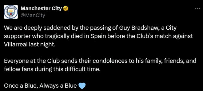 曼城队官方今天也通过社交媒体表示:“我们对曼城球迷盖伊·布拉德肖的去世深感悲痛,他昨晚在俱乐部对阵比利亚雷亚尔的比赛前在西班牙不幸去世。在这个艰难的时刻,俱乐部的每个人都向他的家人、朋友和同伴们致以慰问。一日蓝月,终生蓝月。”比利亚雷亚尔对此也表示:“我们与他的家人、朋友以及所有曼城球迷同在。愿他安息。”