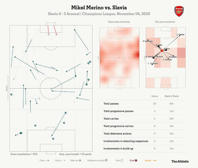 北京时间11月5日,欧冠联赛阶段第四轮,阿森纳客场3-0击败布拉格斯拉维亚,赛后,The Athletic发表专题文章分析了本场比赛阿森纳的表现,以下为专题文章。阿森纳战胜布拉格斯拉维亚,延续了本赛季欧冠的完美开局。阿尔特塔的球队在第30分钟经过视频助理裁判检查后获得一粒点球,萨卡操刀命中右下角,帮助球队取得领先。比分保持到半场结束。但下半场开始仅60秒,特罗萨德左路突破防守球员后,送出一记低平传中,梅里诺顺势将球打入。随后,梅里诺在第68分钟再下一城。阿森纳在本赛季欧冠前四场比赛中均保持零封的纪录在比赛末段经受考验,裁判阿利亚尔-阿加耶夫最初在第85分钟因本-怀特可能的犯规判罚点球。然而,经过VAR检查,判罚被推翻。道曼,纪录创造者当道曼在第73分钟替换特罗萨德上场时,他创造了欧冠历史,成为欧洲顶级俱乐部赛事中最年轻的出场球员。年仅15岁零308天的道曼打破了此前由穆科科保持的纪录,后者代表多特蒙德出场时为16岁零18天。阿森纳拥有了一位天赋异禀的球员,这归根结底是他为何能在如此年轻的年纪就被信任,完成欧洲首秀的原因。阿尔特塔一直在逐步让他上场,此前已让道曼在英超有过出场,但在完成欧冠首秀后,他将迎来关注度和名声的新高度。道曼上场后立即发挥作用,为阿森纳赢得了一个危险位置的任意球。他的进攻能力和技术意味着他经常遭到对手的夹防,这也是对阵布拉格斯拉维亚比赛中的一个持续主题。在道曼对阵布拉格斯拉维亚上场之前,威尔希尔保持着阿森纳最年轻欧冠出场球员的纪录,这位前中场、现任卢顿主帅在2008年11月对阵基辅迪纳摩时年仅16岁零329天。梅里诺在哲凯赖什缺阵时挺身而出在哲凯赖什因肌肉伤势恢复期间,肩负起锋线重任的梅里诺表现高效。尽管他不像哲凯赖什那样具有同等的威胁,但阿森纳试图以不同的方式使用这位西班牙球员。梅里诺主要被用作头球摆渡的支点,萨卡和特罗萨德则穿插跑动到他身后。梅里诺的第二个进球正是通过头球后蹭,将球送入雅库布-马尔科维奇把守的球门。在此之前,下半场开始仅36秒,梅里诺就用脚内侧凌空抽射,将特罗萨德的传中球打入,帮助阿森纳扩大领先优势。虽然梅里诺不像哲凯赖什那样快速,因此无法提供同等水平的后插上威胁,但他是一名聪明的足球运动员,尤其是在精妙的跑位方面。对于阿尔特塔来说,他是一个可靠的选择,这一点得到了他本赛季为俱乐部和国家队打入9球的事实支持。他很可能在周末对阵桑德兰的比赛中继续首发担任中锋。阿尔特塔坚持强阵首发收获回报对于阿尔特塔来说,更轻松的选择——尤其是考虑到他们在本赛季欧冠拥有完美战绩,并且周末要客场挑战桑德兰——本应是轮换关键主力球员。然而,阿尔特塔并没有选择那条路,而是依靠萨利巴、加布里埃尔、廷贝尔、赖斯和萨卡来确保他们本赛季欧冠100%的胜率得以保持。考虑到进攻线遭遇的伤病潮——哲凯赖什、马杜埃凯、哈弗茨和马丁内利全部缺阵——你可以理解为何阿尔特塔认为让萨卡首发并发挥作用很重要。他也将埃泽列入了替补名单。让赖斯在中场首发可能被视为一个风险,因为他再吃一张黄牌就将停赛一场,但这位球员避免了任何鲁莽的铲抢。关于阿森纳本赛季阵容深度的话题已被多次讨论,而他们在缺少常规的攻击手阵容以及中场苏比门迪的情况下,依然能确保又一场欧洲胜利,这恰好凸显了阿尔特塔麾下球队的质量。【上咪咕独家看英超】