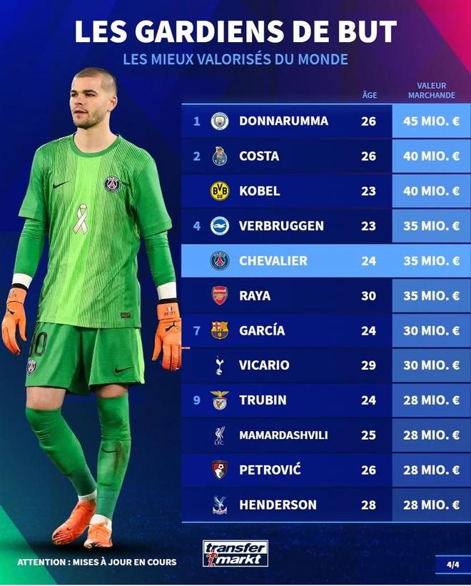 北京时间12月15日,在更新了法甲球员的身价之后,德转列出了目前世界足坛身价排名前10的门将,多纳鲁马4500万欧元第一,此次更新后身价下跌500万欧元的舍瓦利耶以3500万欧元并列第四。德转世界足坛门将身价榜TOP10:1. 多纳鲁马(曼城) 26岁 4500万欧元2. 迪奥戈-科斯塔(波尔图) 26岁 4000万欧元2. 科贝尔(多特蒙德) 28岁 4000万欧元4. 巴尔特-费布鲁亨(布莱顿) 23岁 3500万欧元4. 舍瓦利耶(巴黎圣日耳曼) 24岁 3500万欧元4. 戴维-拉亚(阿森纳) 30岁 3500万欧元7. 霍安-加西亚(巴塞罗那) 24岁 3000万欧元7. 维卡里奥(托特纳姆热刺) 29岁 3000万欧元9. 特鲁宾(本菲卡) 24岁 2800万欧元9. 马马尔达什维利(利物浦) 25岁 2800万欧元9. 彼得罗维奇(伯恩茅斯) 26岁 2800万欧元9. 迪恩-亨德森(水晶宫) 28岁 2800万欧元【上咪咕独家看英超】