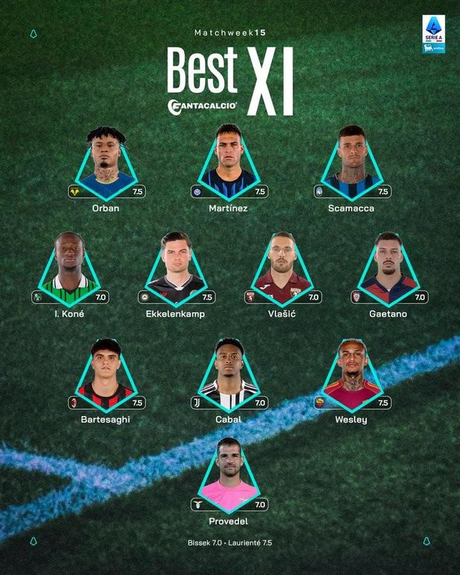 北京时间12月16日,意甲官方公布了联赛第15轮的最佳阵容,劳塔罗、巴尔泰萨吉、卡瓦尔入选。守门员:普罗韦德尔(拉齐奥)后卫:巴尔泰萨吉(米兰)、卡瓦尔(尤文)、韦斯利(罗马)中场:伊斯梅尔-科内(萨索洛)、埃克伦坎普(乌迪内斯)、弗拉希奇(都灵)、加埃塔诺(卡利亚里)前锋:奥尔班(维罗纳)、劳塔罗-马丁内斯(国米)、斯卡马卡(亚特兰大)