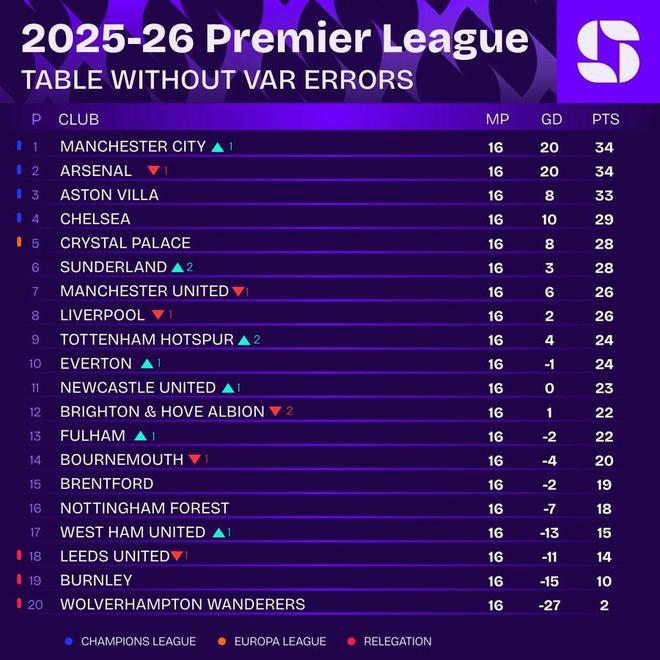 12月17日,数据机构Squawka统计了去掉有争议的VAR判罚的英超积分榜。如果没有VAR争议判罚,曼城将会反超阿森纳,上升到英超榜首的位置。去掉有争议的VAR判罚后的英超积分榜(球队/积分/净胜球)1.曼城 34分 +202.阿森纳 34分 +203.阿斯顿维拉 33分 +84.切尔西 29分 +105.水晶宫 28分 +86.桑德兰 28分 +37.曼联 26分 +68.利物浦 26分 +29.热刺 24分 +410.埃弗顿 24分 -111.纽卡斯尔联 23分 012.布莱顿 22分 +113.富勒姆 22分 -214.伯恩茅斯 20分 -415.布伦特福德 19分 -216.诺丁汉森林 18分 -717.西汉姆联 15分 -1318.利兹联 14分 -1119.伯恩利 10分 -1520.狼队 2分 -27与现有积分榜相比,曼城和阿森纳互换了位置,曼城来到榜首。桑德兰则上升2位来到第6,曼联和利物浦均下降1位。热刺上升2位来到第9,上升1位的还有埃弗顿、纽卡斯尔联、富勒姆和西汉姆联,布莱顿下降2位,伯恩茅斯和利兹联下降1位。【上咪咕独家看英超】